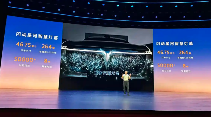 首先在外形上,全新岚图知音在延续老款车型外观设计的基础上,加入了全新的闪动星河智慧灯幕前格栅,46.75英寸灯幕内配备264颗车规级LED灯珠,提供8种预设的灯效,看着还是挺讨女性用户喜欢的。另外,车顶还新增加了192线激光雷达,所以新车也将实现华为乾崑ADS 4驾驶辅助系统。