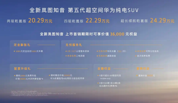 终于来了!20万真满血华系纯电SUV——全新岚图知音正式上市,新车售价20.29-24.29万元,全系共提供3款车型。